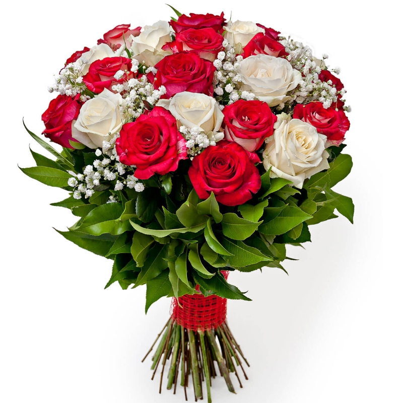 Букет из 25 красных и белых роз с гипсофилой