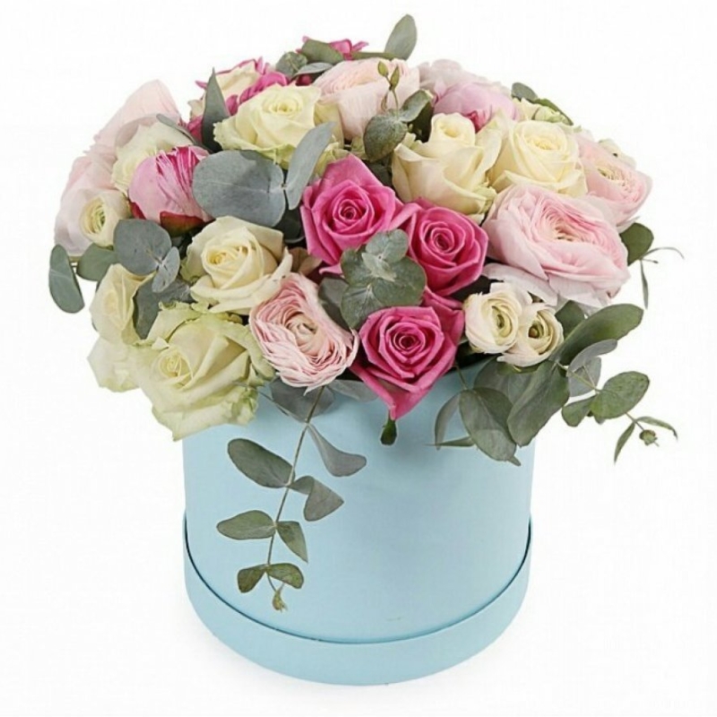 Букет состоит из 17 роз, 9 ранункулюсов, 3 пионовидные розы, эвкалипт, коробка, оазис.