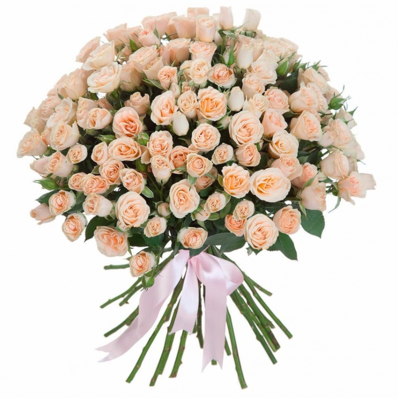 Букет состоит из 25 кустовых кремовых роз, прозрачная упаковка, атласная лента.